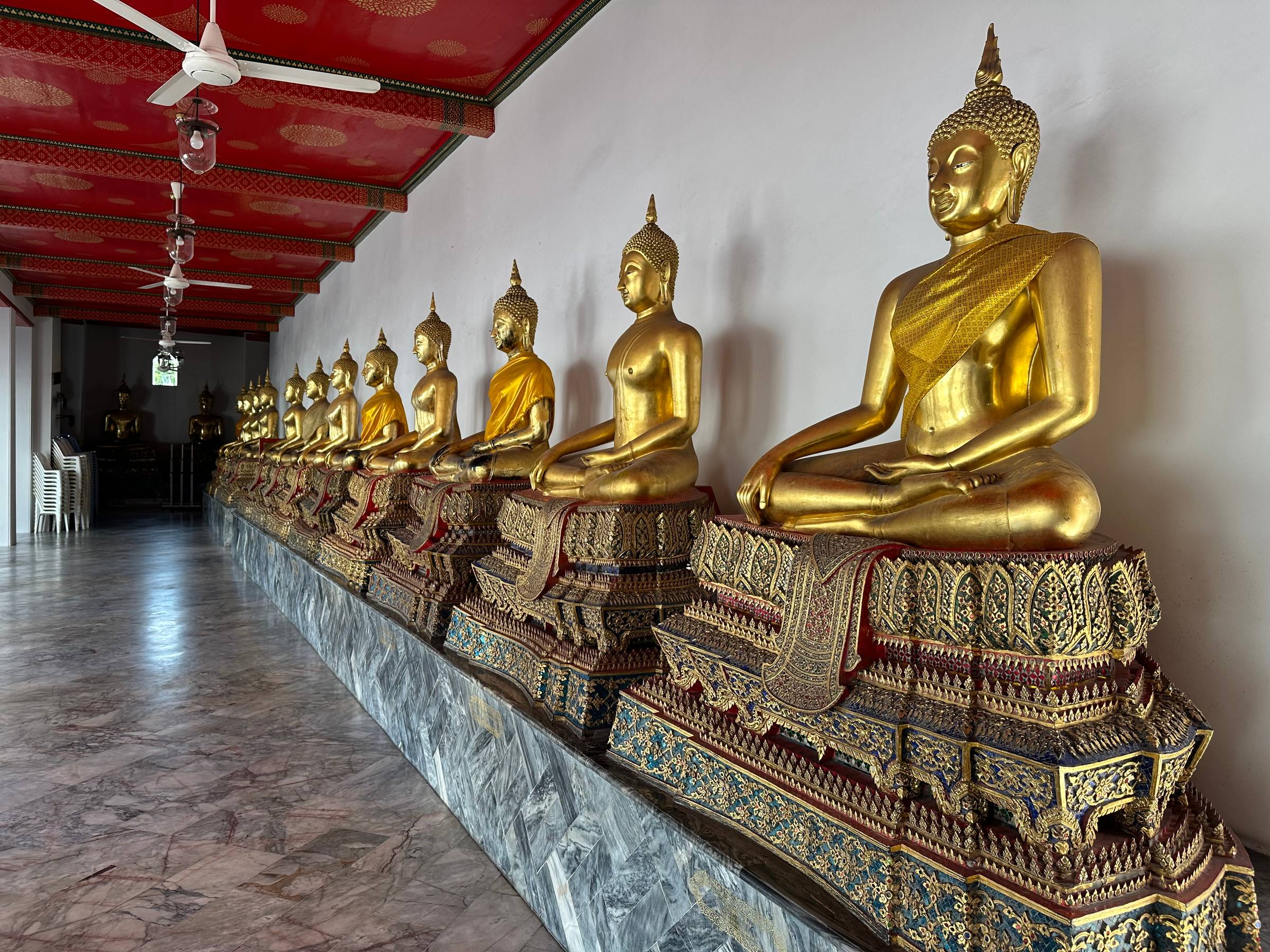 Many golden Buddha statues can be found at Wat Pho in Bangkok